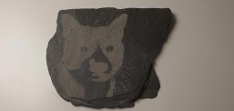 Aus einem Katzenfoto entstand eine Lasergravur auf Schiefer.